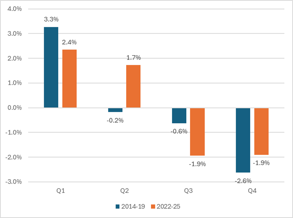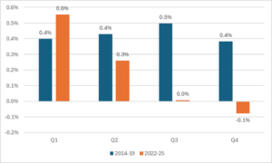However, although the period covered is short, over the later period, 2022–25, the pattern is one of much higher growth in the first two quarters – particularly in the first quarter – than in the second half of the year. (The mean quarterly figures in Chart 1 mask a decreasing trend; a fuller presentation of the quarterly data, with a moving average, is shown for each period in Charts A1 and A2 in the Annex.)