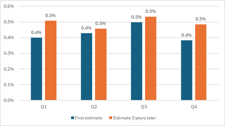 It is also important to consider whether the revisions process changes the story. Chart 3 shows, for 2014–19, both the first estimates and the values reported by ONS three years later. (Similar results cannot yet be presented for the post-pandemic period as a sufficient run of data is not available.) It is notable that each quarter has, on average, been revised up by around 0.1 percentage point, but there is no apparent seasonal pattern to the revisions. It will be important in due course to confirm this finding for the more recent period, and the issue of seasonality in revisions should be considered as part of ONS’s annual review of GDP revisions.