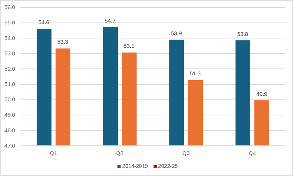 The PMI data shown in Chart 4 suggest that, like the official GDP data, over the last few years (2022–25), economic output has grown more strongly in the first half of the year, and particularly in the first quarter.
