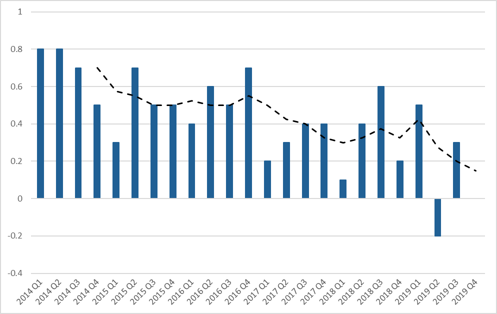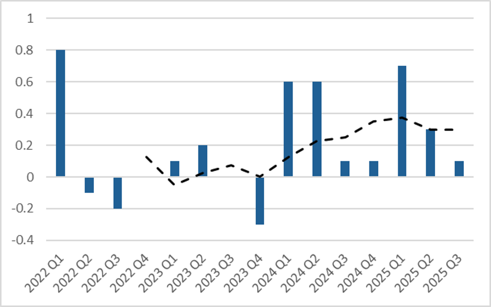 Compliance review of Treatment of Seasonality in Quarterly GDP statistics Published: 17 March 2026 Last updated: 17 March 2026 AnnexChart A1. Quarterly GDP growth for 2014 to 2019 in first-release data. Source: OSR calculations based on ONS data Chart A2. Quarterly GDP growth for 2022 to 2025 in first-release data. Source: OSR calculations based on ONS data « Previous