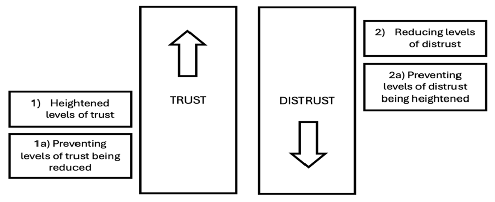 This conscious untangling of these two distinct concepts allows research, understanding and consequently strategies and recommendations to be tailored to the appropriate measure of either: 1) heightening levels of trust; or 2) reducing levels of distrust. Within these two overarching objectives, the supplementary ambitions, 1a) preventing levels of trust being reduced; and 2a) preventing levels of distrust being heightened, come together like so:
